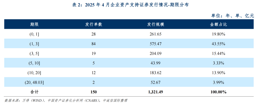 从期限分布情况来看,2025年4月发行的产品中,期限最短为0.30年,系“中国交建供应链金融2号第4期资产支持专项计划”;期限最长为48.03年,系“华泰资管-苏州恒泰租赁住房1号资产支持专项计划”。发行期限在(1, 3]年的产品数量最多,发行数量合计84单,规模占比为43.55%。具体期限分布如下表所示: