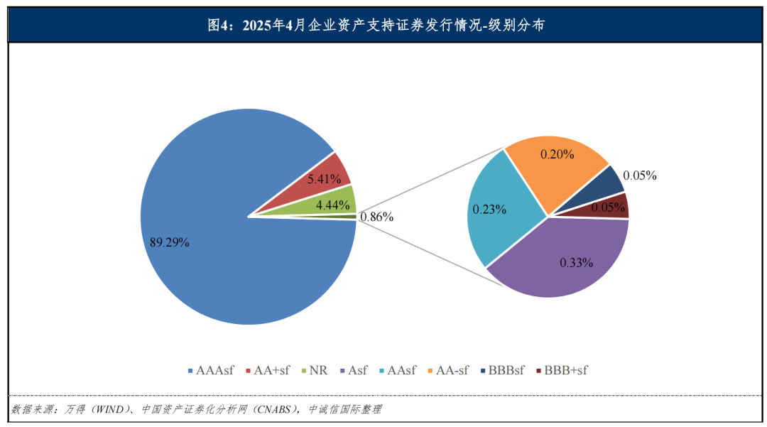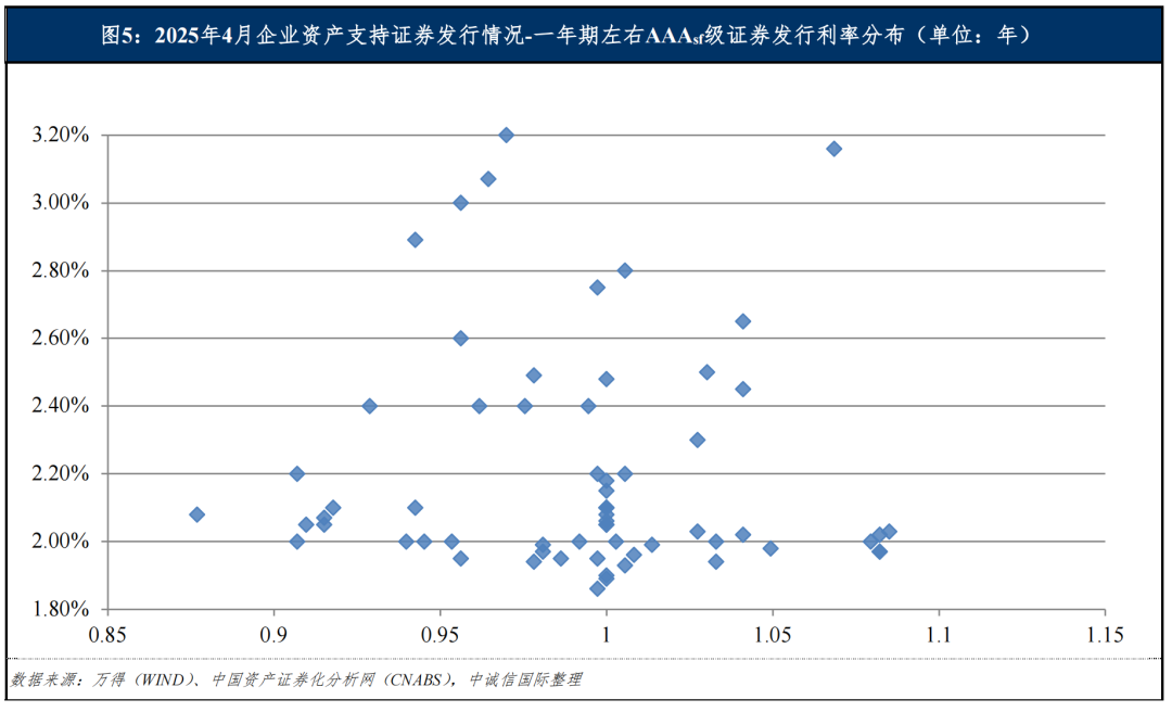 从发行利率来看,我们选取一年期左右3AAAsf级证券的发行利率为样本进行观察,2025年4月最低发行利率为1.86%,最高发行利率为3.20%。一年期左右AAAsf级证券利率中枢大致位于1.90%~2.20%之间,中位数环比下降约17BP,同比下降约37BP。
