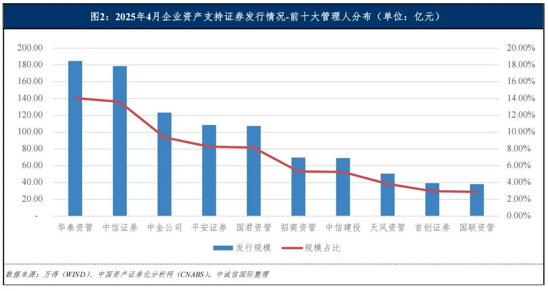 从管理人分布来看,2025年4月,新增管理规模占比前五大的管理人分别为华泰证券(上海)资产管理有限公司、中信证券股份有限公司、中国国际金融股份有限公司、平安证券股份有限公司和上海国泰君安证券资产管理有限公司,规模占比分别为14.06%、13.61%、9.39%、8.27%和8.17%。前五大管理人新增管理规模合计702.97亿元,占比53.50%;前十大管理人新增管理规模合计969.68亿元,占比73.80%。具体情况如下图所示: