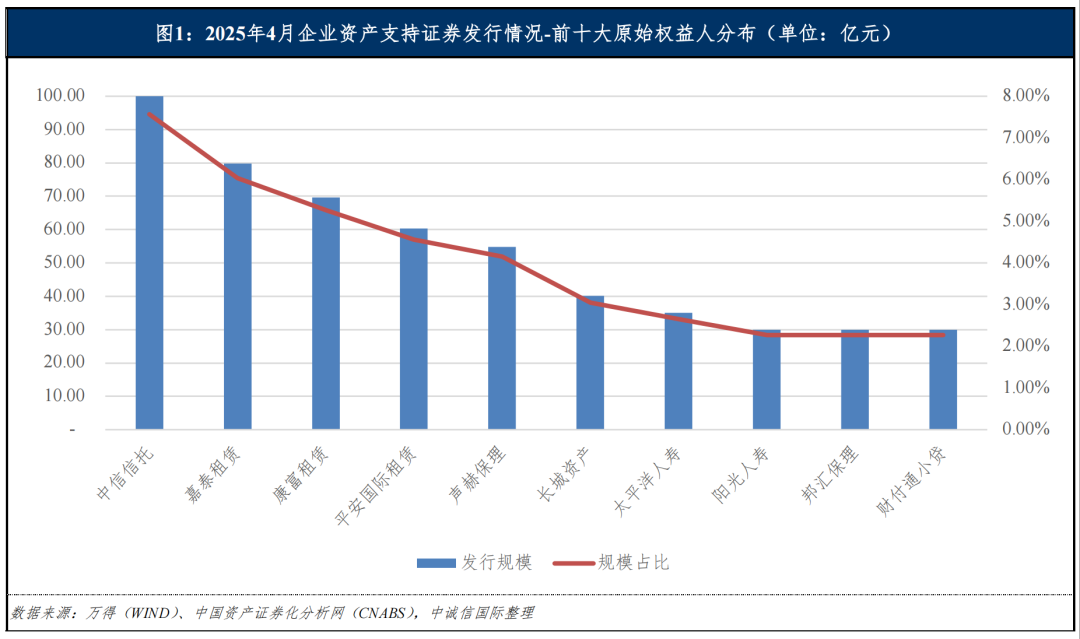 从原始权益人2分布来看,2025年4月,中信信托有限责任公司位居第一,其发行规模为100.00亿元,占比7.57%;山东通汇嘉泰融资租赁有限公司位居第二,其发行规模为79.84亿元,占比6.04%;中国康富国际租赁股份有限公司位居第三,其发行规模为69.68亿元,占比5.27%;平安国际融资租赁有限公司和声赫(深圳)商业保理有限公司分别位居第四和第五,发行规模分别为60.29亿元和54.85亿元,占比分别为4.56%和4.15%。前五大原始权益人发行规模合计364.66亿元,占比27.59%;前十大原始权益人发行规模合计529.86亿元,占比40.10%。具体情况如下图所示: