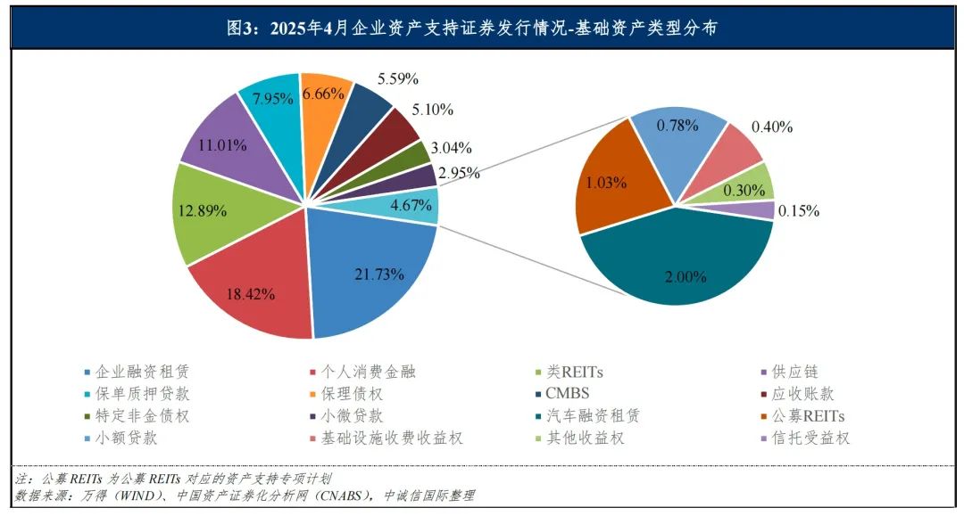 从基础资产类别来看,2025年4月发行的企业资产支持证券基础资产细分类型涉及企业融资租赁、个人消费金融、类REITs、供应链和保单质押贷款等。其中企业融资租赁共发行26单产品,规模占比为21.73%;个人消费金融共发行31单产品,规模占比为18.42%;类REITs共发行6单产品,规模占比为12.89%。具体分布如下图所示: