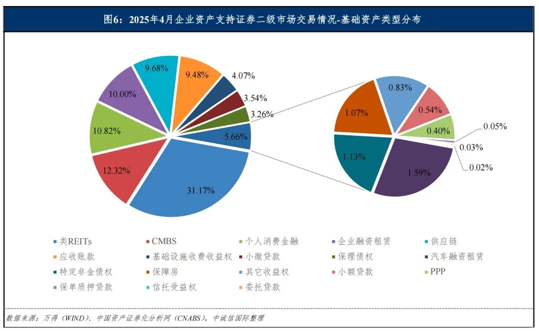 从交易标的基础资产类型分布来看,根据万得(WIND)和中国资产证券化分析网(CNABS)数据,2025年4月二级市场交易较活跃的品类主要为类REITs、CMBS、个人消费金融、企业融资租赁和供应链等,成交金额占比分别为31.17%、12.32%、10.82%、10.00%和9.68%。