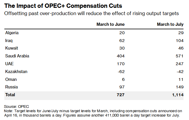 上述八个成员国中有七个承诺至少在截至7月的部分时间内对过去的超额生产行为进行补偿。根据估算,兑现补偿超额行为的承诺将令7月原油产量较3月增加110万桶/日。