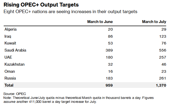 而在本周六,OPEC+单独开会讨论7月份增产石油的事宜。市场关注焦点转向该联盟中八个成员国组成的小组,这是真正牵动市场神经的关键决定,这些成员国此前在执行自愿减产协议。是否延续日增41.1万桶的激进增产步伐,将由这八个核心成员国在周六的视频会议中敲定。