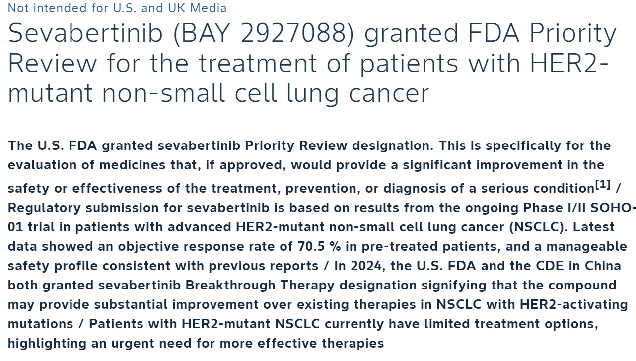 2927088)获FDA授予优先审评资格,用于治疗已经接受过一种系统治疗的HER2突变非小细胞肺癌患者。