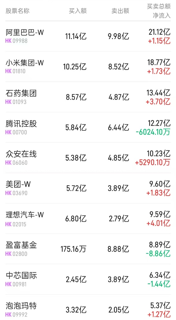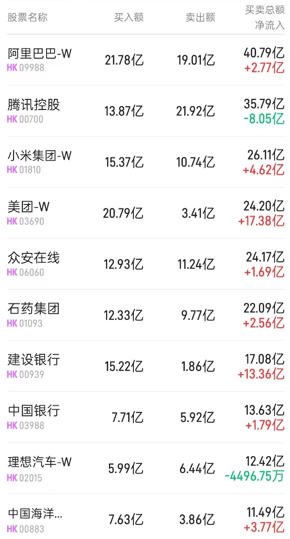 此外,阿里巴巴-W(09988)、中海油(00883)、泡泡玛特(09992)分别获净买入3.92亿、3.77亿、1.27亿港元,而腾讯(00700)遭净卖出8.65亿港元。