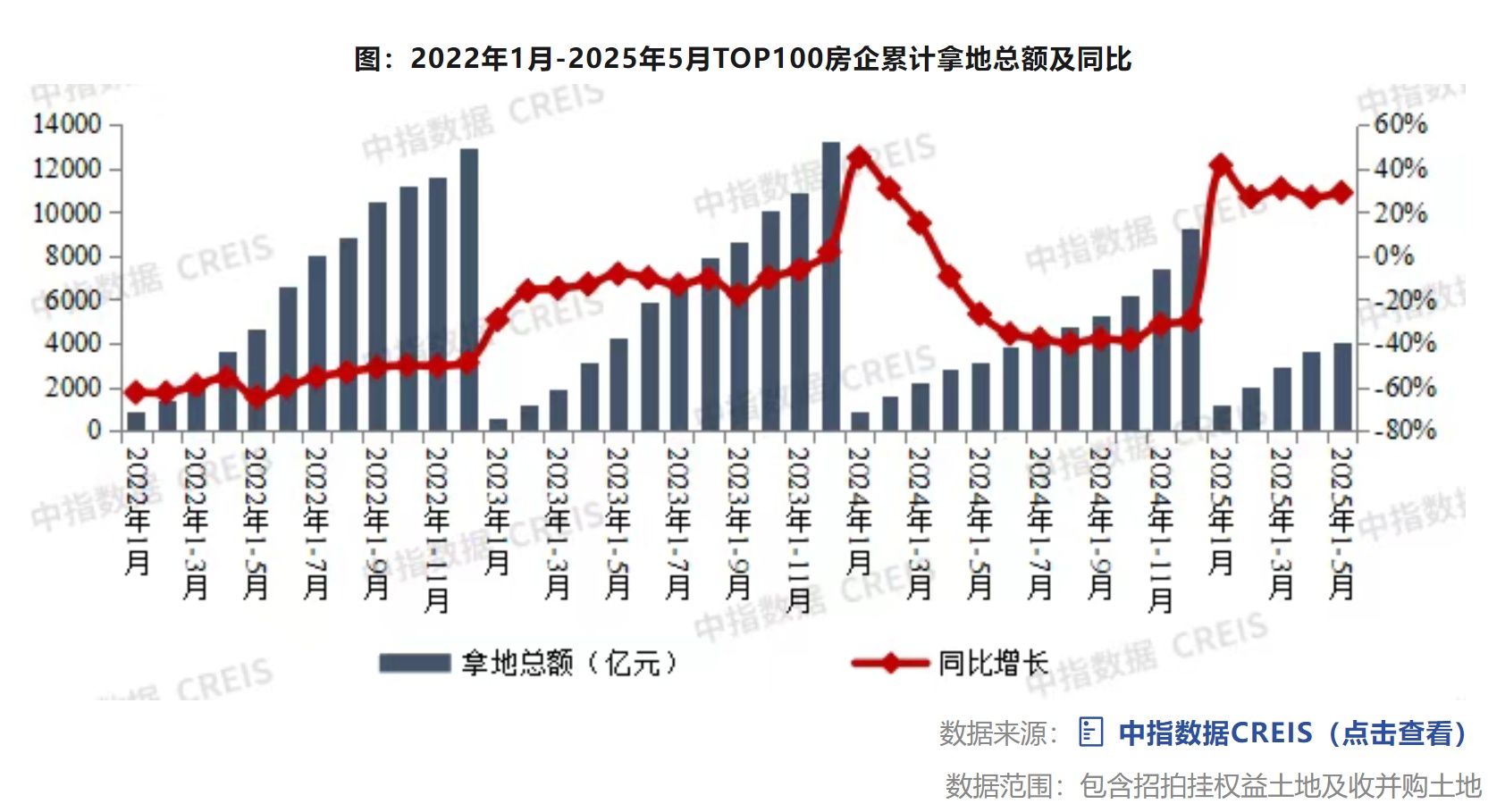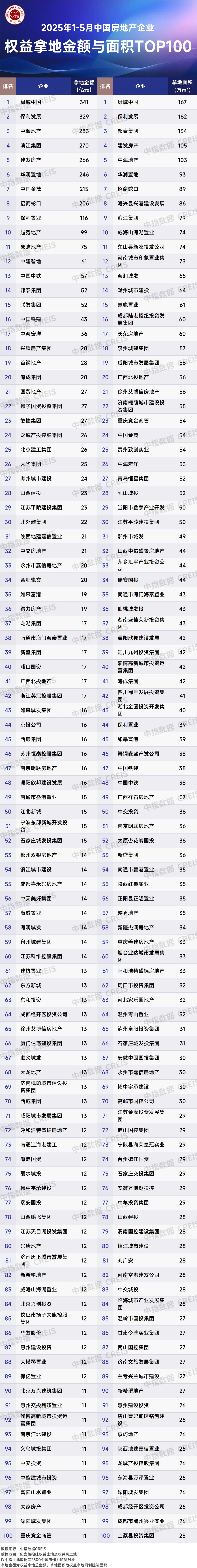 智通财经APP获悉,5月30日,中指研究院发文称,2025年1-5月,TOP100企业拿地总额4051.9亿元,同比增长28.8%,增幅较上月扩大2.2个百分点。受上年低基数影响,TOP100企业拿地同比增幅较上月扩大。拿地企业仍以央国企为主,拿地金额前十企业中8家为央国企,部分民企亦有一定投资强度,如滨江集团拿地金额位居前十,邦泰集团、兴耀房产集团、海成集团等也进入拿地金额前二十。