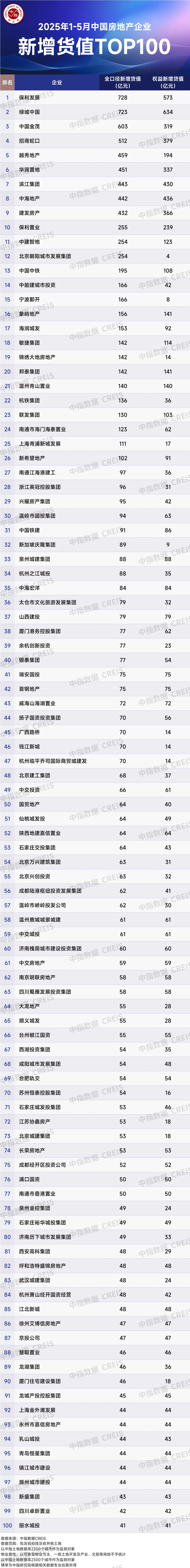 从新增货值来看,保利发展、绿城中国和中国金茂位列前三。2025年1-5月,保利发展以728亿元新增货值占据榜单第一,绿城中国以723亿元新增货值位列第二,中国金茂新增货值规模为603亿元,位列第三。TOP10企业2025年1-5月新增货值总额5046.7亿元,占TOP100企业的41.8%,新增货值门槛为41亿元。