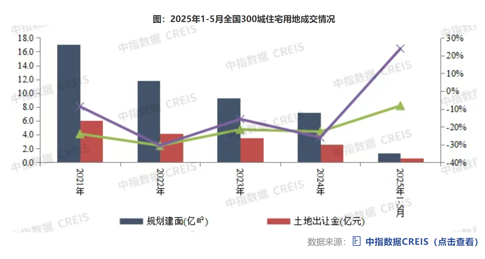 2025年1-5月,全国300城住宅用地成交1.3亿平,同比小幅下降,土地出让金同比增长超两成。5月,全国300城住宅用地土地出让金同比小幅增长,增幅较上月下滑。核心城市优质地块仍维持较高热度。5月29日,杭州拱墅区康桥单元住宅用地溢价率40.33%。5月23日,成都郫都区郫筒街道望丛东路17号溢价成交,溢价率59.34%。5月20日,北京海淀区半壁店宅地溢价率11.95%。从企业端来看,重点企业拿地主要集中北京、杭州、上海、成都等核心城市。这种结果折射出当前土地市场的核心逻辑,地块属性决定热度分化,房企拿地策略聚焦“确定性”,当前房企拿地资金向聚焦收益确定性高和现金流回笼快的项目倾斜。
