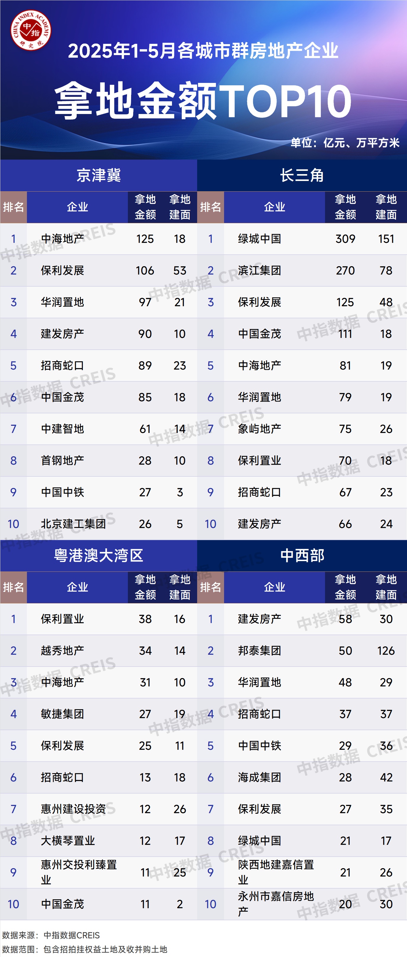 从各城市群拿地金额来看,长三角位居四大城市群之首。2025年1-5月,长三角TOP10企业拿地金额1252.7亿元,位居四大城市群之首,京津冀TOP10企业拿地金额734.0亿元,位列第二;中西部TOP10企业拿地金额339.0亿元,位居第三。