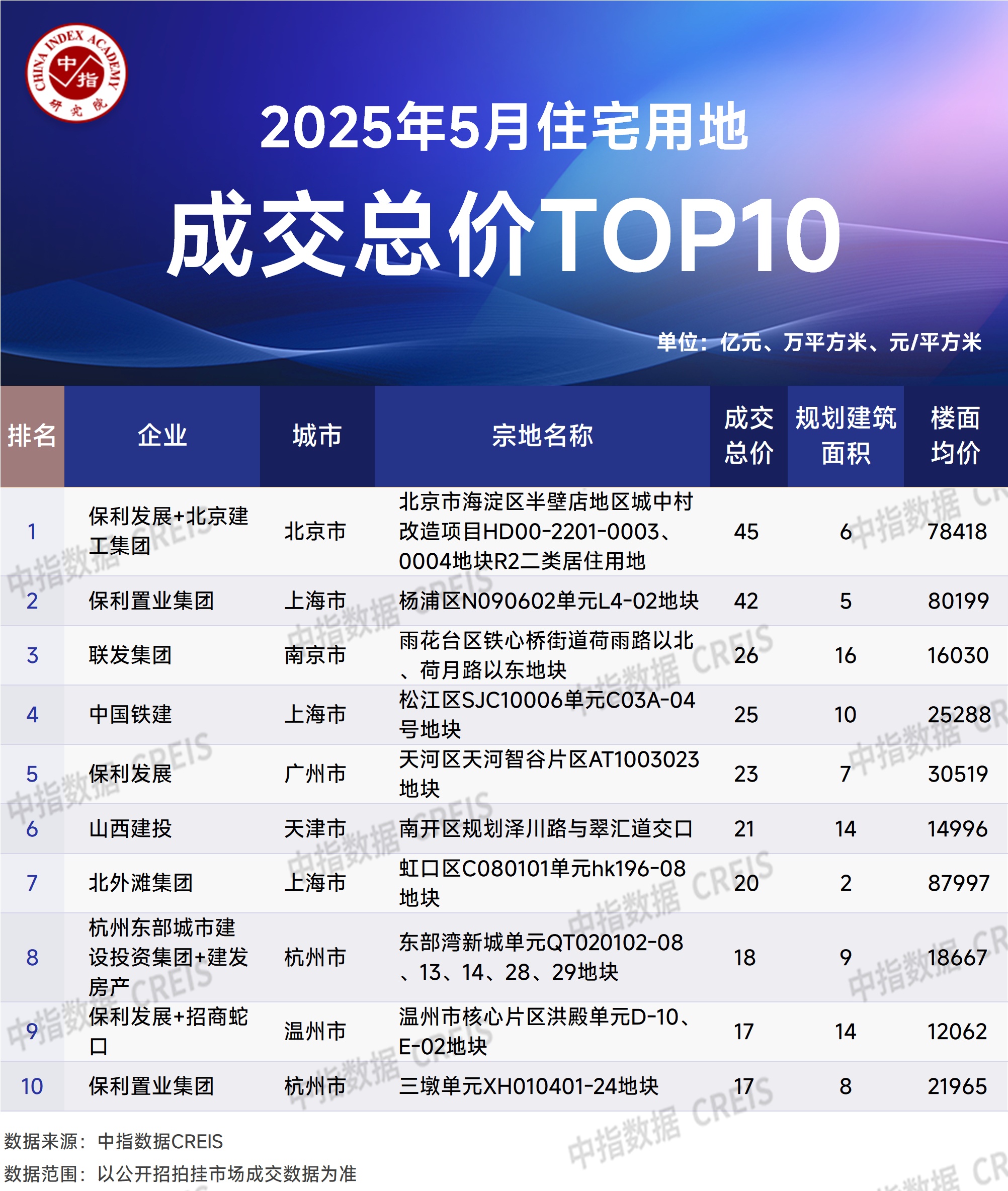 从全国住宅用地成交总价TOP10来看,5月北京、上海、南京、广州、温州等多个城市均拍出高总价地块。入榜地块中,北京市海淀区半壁店地区地块以总价45亿元位居榜首,该地块溢价率为11.95%,由保利发展+北京建工集团联合摘得。从城市来看,上海有4宗地入榜,总成交金额87.3亿元,杭州有2宗地块入榜,总成交金额34.7亿元,北京、南京、天津、温州各有1宗地块入榜。从拿地企业来看,高总价地块拿地企业以央国企为主,其中,保利置业集团摘得2宗,保利发展共摘得3宗,2宗为与其他房企联合竞得。