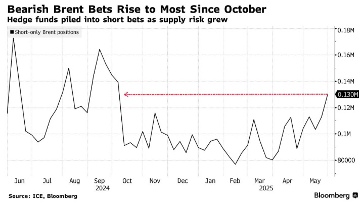 据洲际交易所欧洲(ICE Futures Europe)汇编的统计数据,截至5月27日当周,对冲基金经理们将国际原油价格基准——布伦特原油期货的“仅空头”头寸增加16,922 手,至130,019手,空头规模创下八个月新高点位。与此同时,美国商品期货交易委员会(CFTC)统计数据显示,针对北美原油价格定价基准——WTI原油期货的“仅空头”押注升至三周以来的高点。