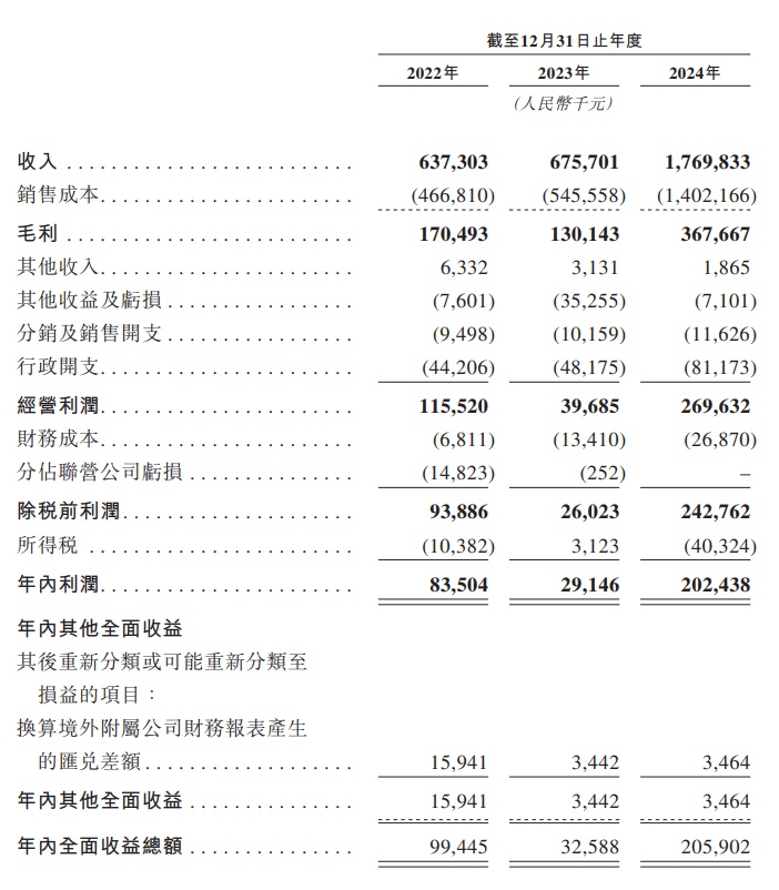 业绩方面,于2022年度、2023年度及2024年度,金浔股份实现收入分别约为6.37亿元、6.76亿元、17.70亿元人民币;同期,年内全面收益总额分别为9944.5万元、3258.8万元、约2.06亿元人民币。