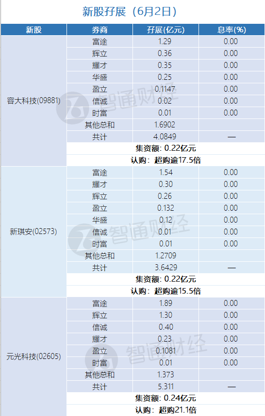 智通财经APP获悉,容大科技(09881)、新琪安(02573)、元光科技(02605)正在招股中。截止6月2日,富途、耀才、辉立等券商合计为容大科技借出4.0849亿港元,超购逾17.5倍;合计为新琪安借出3.6429亿港元,超购约15.5倍;合计为元光科技借出5.311亿港元,超购约21.1倍。