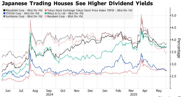 日本五大贸易公司均发布了对本年度盈利的谨慎预测,并预留了数亿美元用于应对关税不确定性。尽管存在这些担忧,但这些公司仍积极寻求提高股息。三菱商事、三井物产、住友商事和丸红株式会社预计的 12 个月股息收益率均超过 3.5%,超过了 2025 年年度基准指数(东证指数)所预估的 2.7%的平均水平。尽管伊藤忠商事预计的 12 个月股息收益率为 2.66%,但它与另外四家公司一样,在过去五年中股息发放额翻了一番。