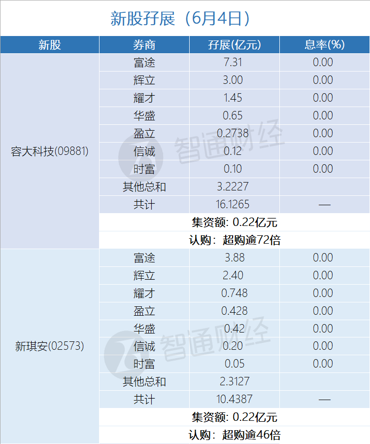 智通财经APP获悉,容大科技(09881)、新琪安(02573)、元光科技(02605)正在招股中。截止6月4日,富途、耀才、辉立等券商合计为容大科技借出16.1265亿港元,超购逾72倍;合计为新琪安借出10.4387亿港元,超购约46倍;合计为元光科技借出39.0962亿港元,超购约161倍。