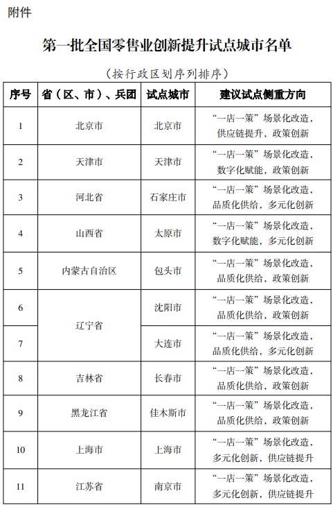 商务部等5部门办公厅关于公布第一批全国零售业创新提升试点城市名单的通知
