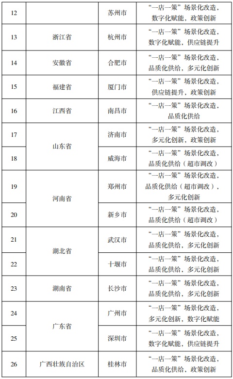 省级相关部门要指导试点城市按照当地历史文化、资源禀赋、行业基础、规划布局,侧重2—3个试点探索方向,因地制宜推动试点建设差异化、特色化发展。要问需于企,问计于企,调动企业创新转型的积极性,依靠市场化力量“一店一策”推动存量商业设施改造提升。要加强政策激励,推行清单管理,选出有特色、有代表性、引领带动性强的项目。