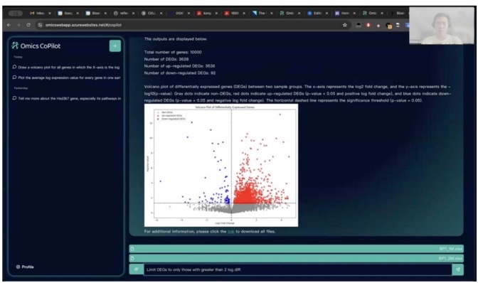 Biostate.AI 不仅在湿实验室技术上进行创新,更通过一系列AI 工具,将复杂的生物信息学分析和科学写作流程标准化、智能化,从而大幅加速科研进程和临床转化。其推出的AI数据分析助手 (OmicsWeb Copilot)专门用于RNA测序数据的分析与可视化,允许科学家通过自然语言对话来分析复杂的RNA数据。基于最新的大型语言模型技术,OmicsWeb Copilot能够理解用户的问题,确定合适的统计方法,生成统计学上严谨的分析代码,并在安全的云环境中运行分析。这项创新彻底颠覆了传统生物信息学分析的技术门槛,使缺乏计算背景的科研人员也能轻松获取深度生物学洞察,大幅拓宽了科研参与群体与研究边界。