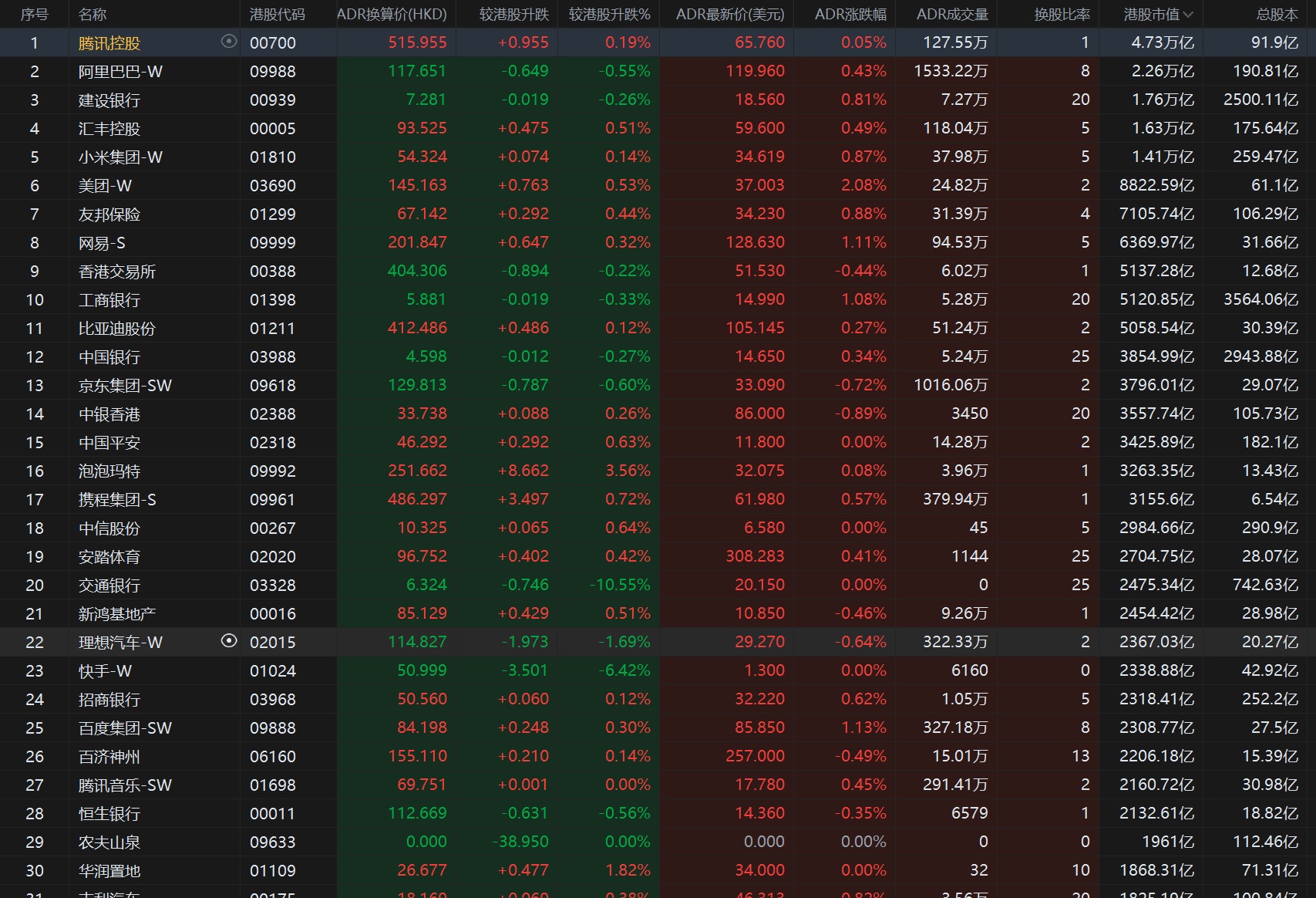 智通财经APP获悉,周四美股三大股指齐跌,恒生指数ADR下跌,按比例计算,收报23871.28点,较香港收市跌35.69点或0.15%。