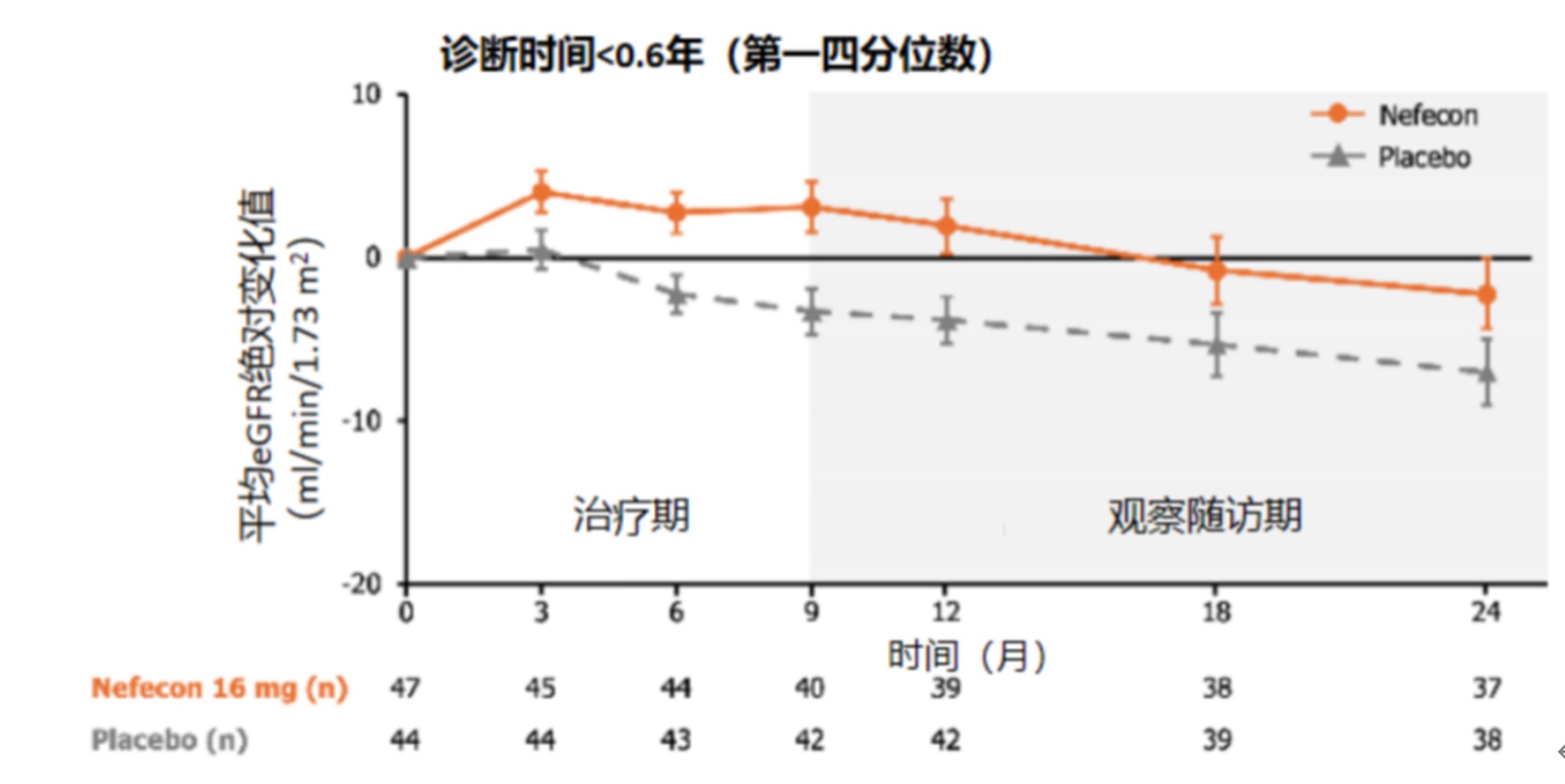结果显示,无论诊断时间长短,布地奈德肠溶胶囊相较于安慰剂均能显著保护肾功能(eGFR)并降低UPCR,且在近期确诊的IgA肾病患者中肾功能的保护作用更为显著。与安慰剂相比,布地奈德肠溶胶囊组在所有四分位数中均有eGFR获益。与安慰剂组相比,在基线时确诊时间<0.6年的患者中,布地奈德肠溶胶囊组的eGFR在9、12和24个月时分别增加6.41、5.78和4.79 ml/min/1.73 m²,且治疗9个月内及停药后3个月eGFR均高于基线水平(图1)。该结果支持早期使用布地奈德肠溶胶囊治疗以延缓疾病进展和肾功能丧失。