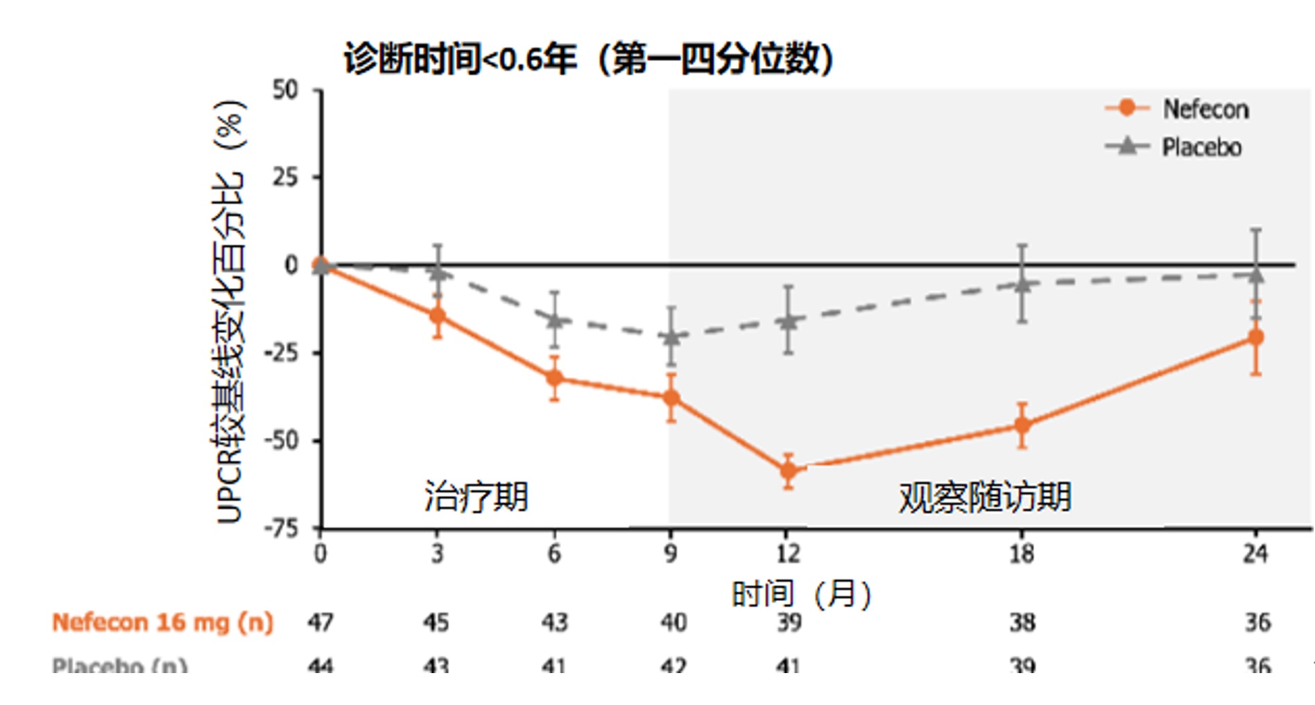 而且,布地奈德肠溶胶囊在所有四分位数中均降低UPCR。与安慰剂组比较,在基线时确诊时间<0.6年的患者中,布地奈德肠溶胶囊组在治疗9个月停药3个月后UPCR降幅达51.12%(图2),而在基线时确诊时间≥6.4年的患者中降幅为42.88%,提示新诊断患者使用布地奈德肠溶胶囊治疗蛋白尿降幅更高。