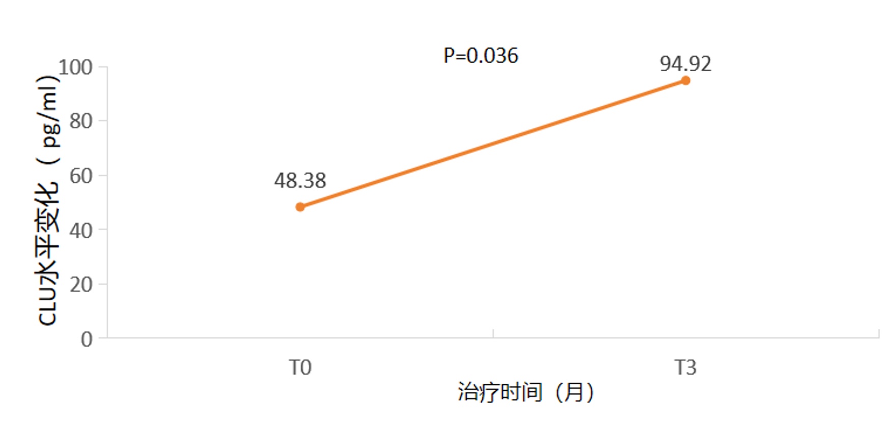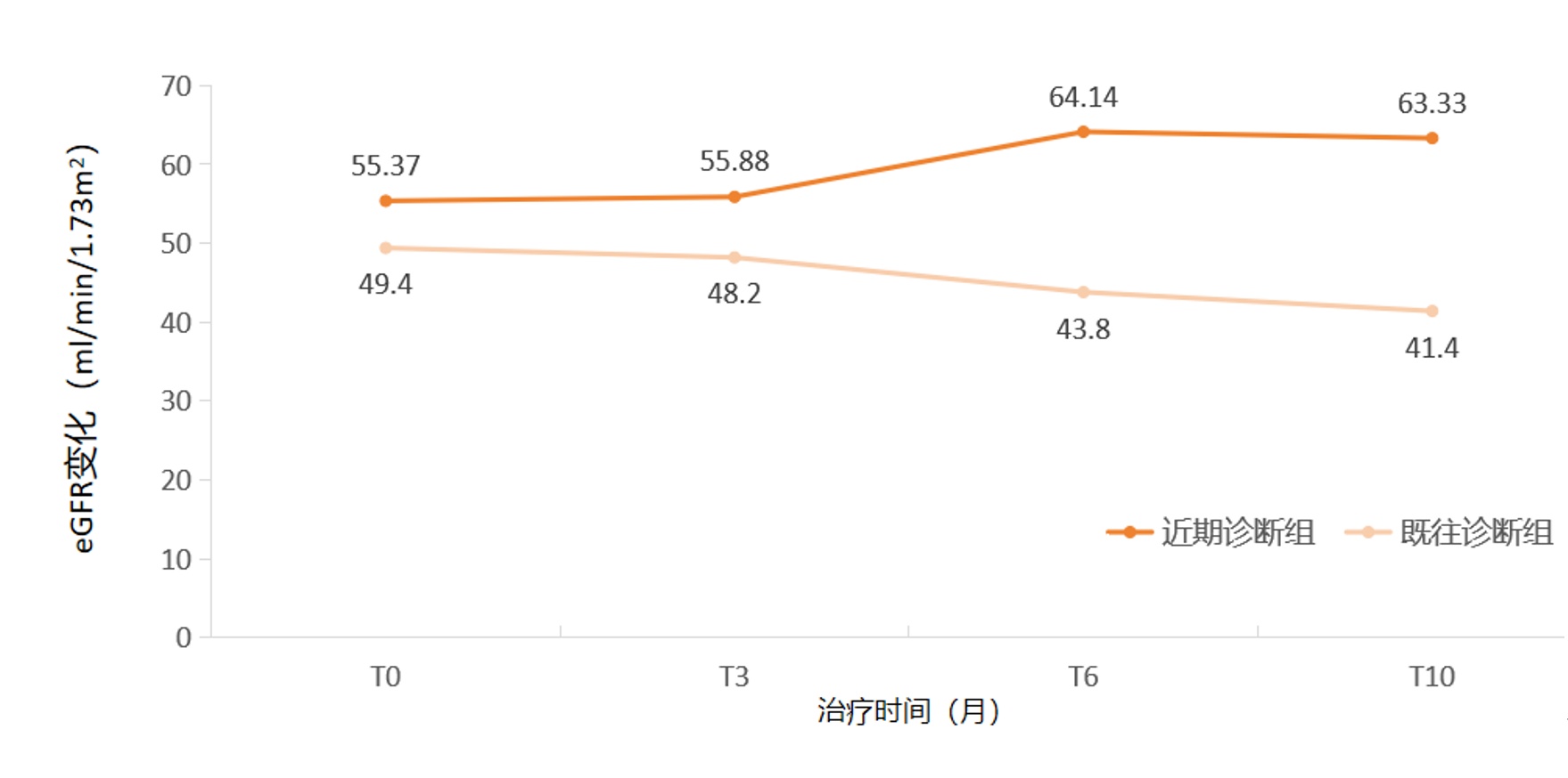 在另一项布地奈德肠溶胶囊治疗对近期诊断和既往诊断IgA肾病患者的炎症过程可能存在不同影响的前瞻性研究中4,将符合条件的IgA肾病白种成人患者根据诊断时间分为两组:近期诊断组(n=8,确诊时间≤6个月)和既往诊断组(n=6,确诊时间>6个月);在近期诊断组中,从T0到T3,簇集蛋白(CLU)水平从48.38 pg/ml增加到94.92 pg/ml,P=0.036(图3),而在既往诊断的患者中无显著差异,提示尽早使用布地奈德肠溶胶囊治疗可能改变肾脏局部的免疫微环境,触发保护性蛋白(如CLU)的表达以修复损伤。此外,从T0到T10,近期诊断患者的eGFR逐渐回升(图4),提示尽早治疗,肾功能保护更佳。