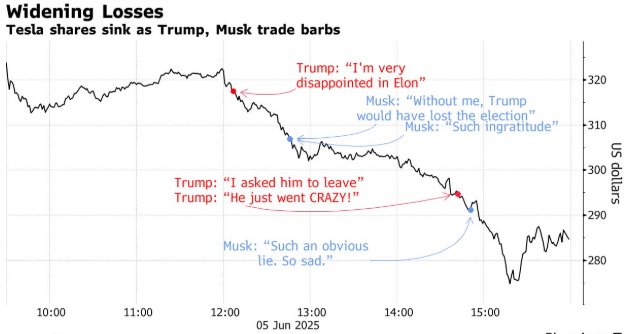 显然,埃隆和特朗普之间的关系已经不再一致。我们不清楚这会产生什么样的后果,这就是人们纷纷抛售股票的原因。这不是那种会有明确结论或解决办法的问题。如果情况进一步恶化,我认为这确实有可能对特斯拉的收益造成损害。他们是这个星球上最具影响力的人物中的两位,如果出现个人之间的争斗,特朗普很可能会获胜。对于股票的影响是无法预测的。目前这纯粹是一种赌博,而且在此之前我们还没有考虑到特斯拉本身已经相当昂贵的情况。在股价下跌的过程中,它可能会变得更具吸引力,但我不敢心安理得地说它现在是便宜的。