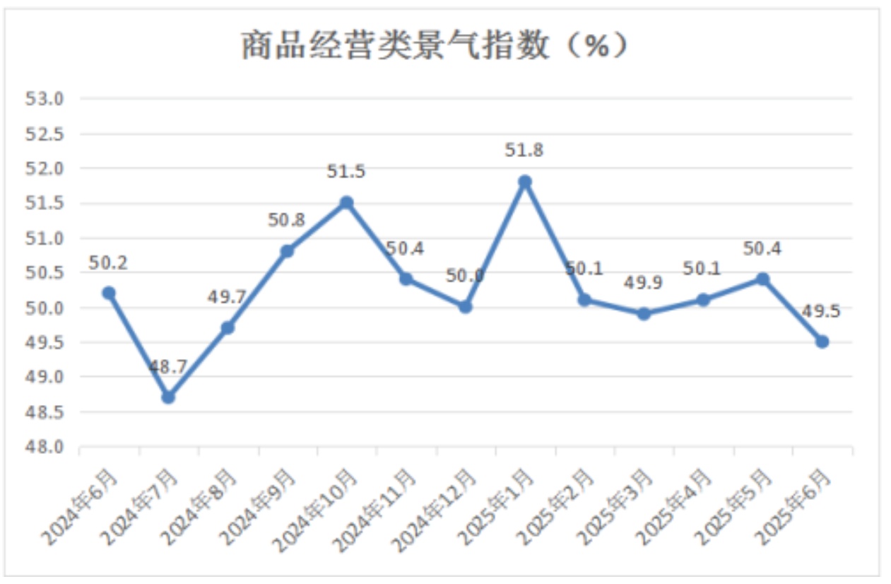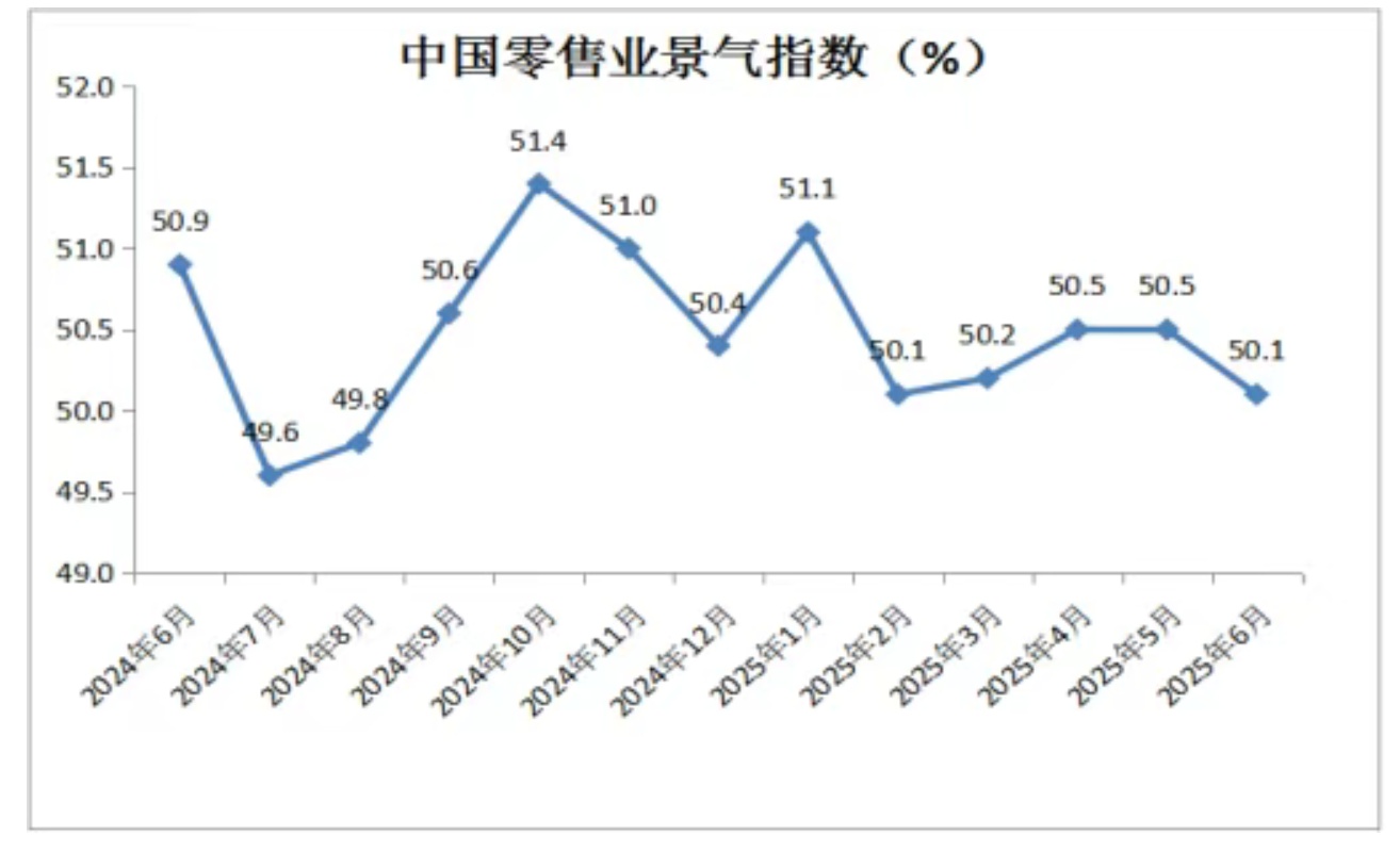 智通财经APP获悉,2025年6月6日,中国商业联合会发布6月份中国零售业景气指数(CRPI)。6月份,中国零售业景气指数(CRPI)为50.1%,较上月小幅下降0.4个百分点,连续10个月维持在扩张区间运行。数据显示,商品经营类景气指数为49.5%,成为影响综合指数下行的主要因素;电商经营类景气指数为50.8%,较上月上升0.8个百分点。