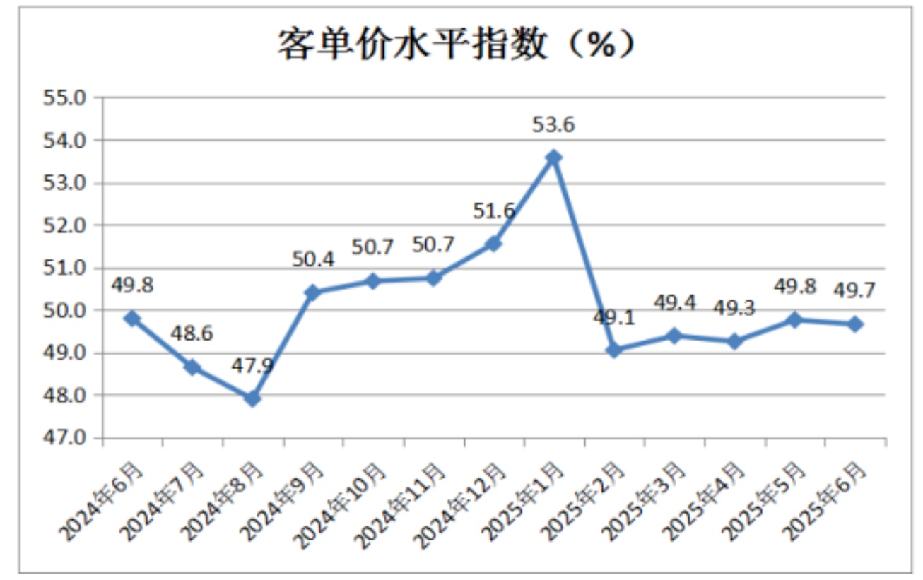 客单价水平指数为49.7%,较上月微降0.1个百分点,连续5个月处于收缩区间。线下商品客单价水平持续5个月在荣枯线下运行,表明线下商品零售市场仍面临较大压力。
