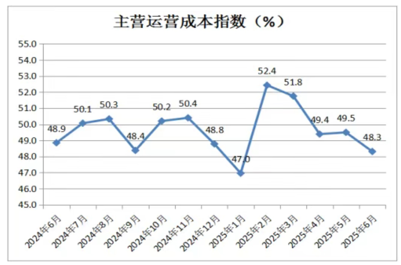 主营业务运营成本反向指数为48.3%,较上月下降1.2个百分点,表明商品经营类企业预期运营成本上升。