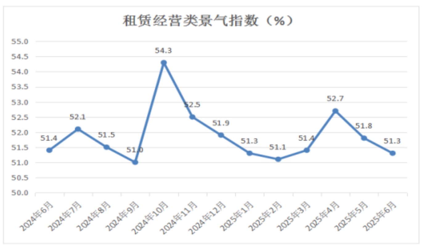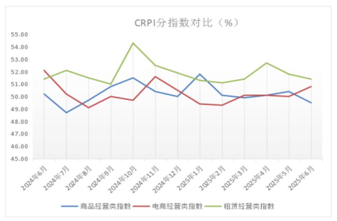从行业分类看,6月零售业三大分类指数出现分化。商品经营类指数为49.5%,较上月下降0.9个百分点;租赁经营类指数为51.3%,较上月小幅下降0.5个百分点;电商经营类指数为50.8%,较上月上升0.8个百分点。