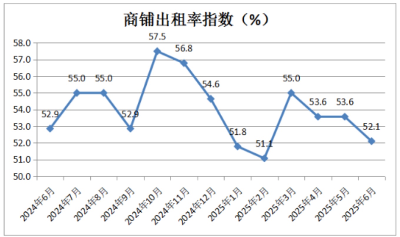 商铺出租率指数为52.1%,较上月下降1.5个百分点,维持在扩张区间运行,表明出租热度有所下降。