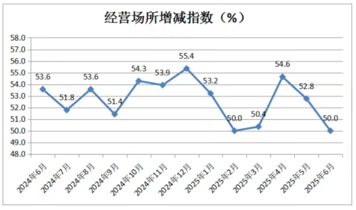 经营场所增减指数为50.0%,较上月大幅下降2.8个百分点至荣枯线,表明租赁经营类企业新开店速度放缓。
