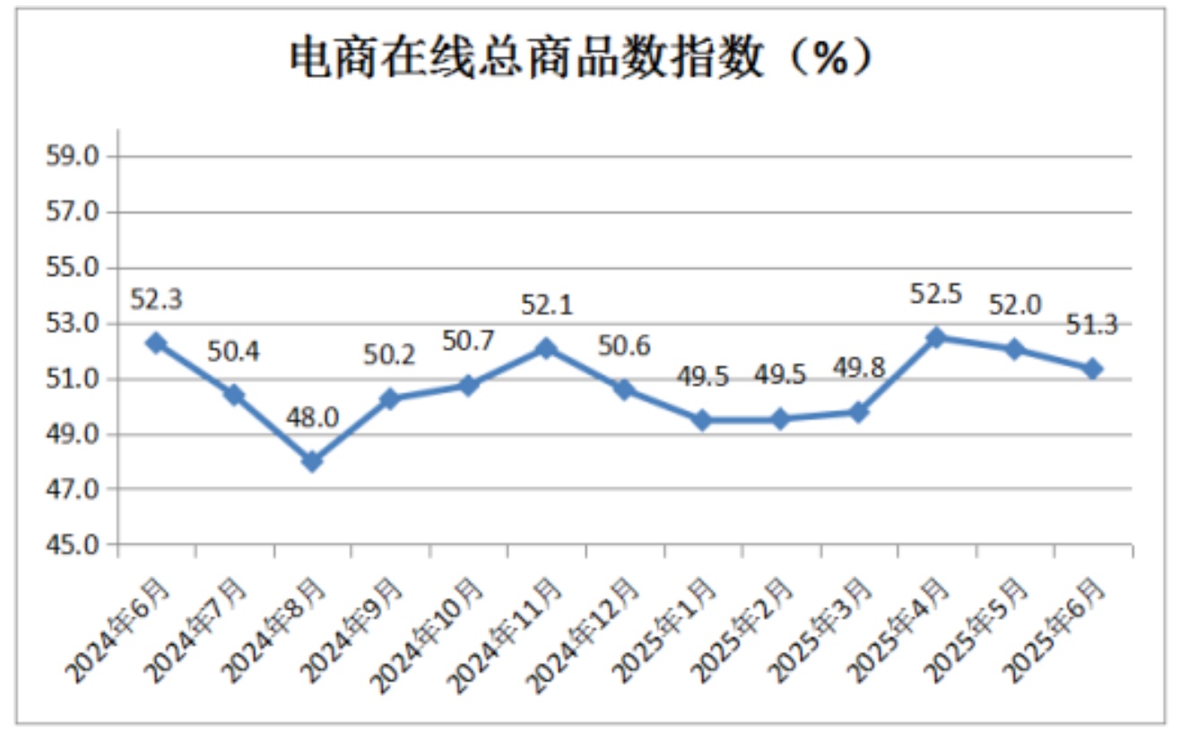 电商在线总商品数指数为51.3%,较上月小幅下降0.7个百分点,表明本月电商经营类企业备货意愿保持稳定。