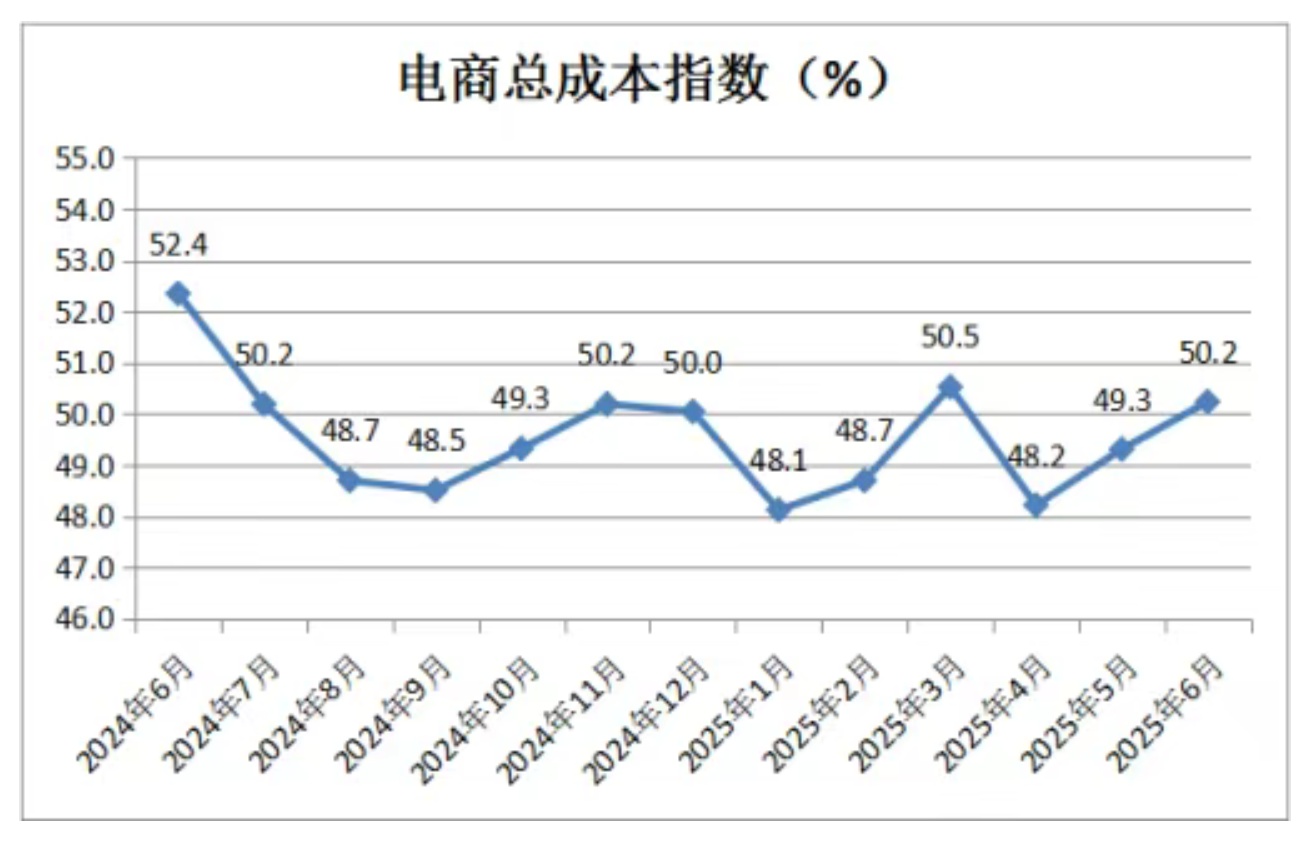 电商总成本反向指数为50.2%,较上月上升0.9个百分点。指数连续上升表明电商经营类企业成本压力持续好转。分析认为,国家以旧换新和消费券补贴政策有效减轻了线上商家“618”促销活动的成本支出。