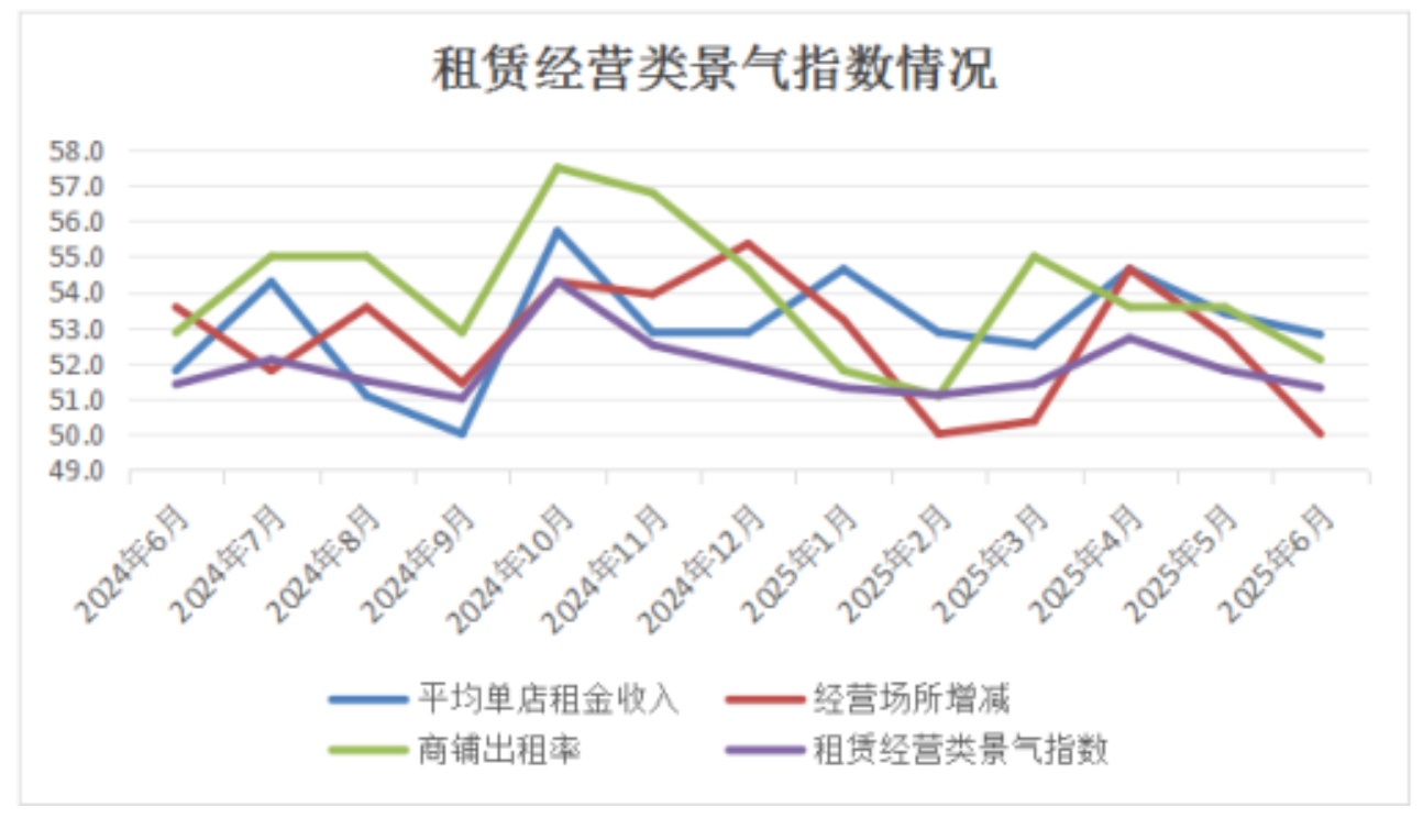 (二)数据显示,6月租赁经营类景气指数受平均单店租金收入、商铺出租率和经营场所增减分指数影响持续下行,但仍维持在荣枯线之上,表明租赁经营类企业逐渐进入稳定增长期。
