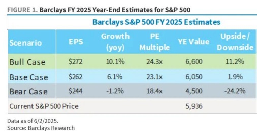 (1)关税不确定性峰值可能已过,这应该会使估值从当前水平小幅扩张,巴克莱将2025年标普500指数目标价从5900点略微上调至6050点。尽管如此,今年迄今每股收益尚未感受到新增关税的冲击,鉴于对美国财政前景的担忧,利率仍处于高位,消费者支出可能回落仍是一个风险,这使得巴克莱的估值假设受到制约,且巴克莱对2025财年每股收益的预期维持在262美元不变。