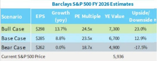 (3)巴克莱给出2026财年每股收益预期为285美元(市场共识预期为301美元),以及2026年标普500指数目标点位6700点,预计收益增长将从2025年的关税冲击中有所恢复正常。相较于今年,明年关税预计不会产生新增直接影响,但对增长和通胀的二阶效应可能会溢出,使消费者支出相较于长期趋势水平仍略显疲软。