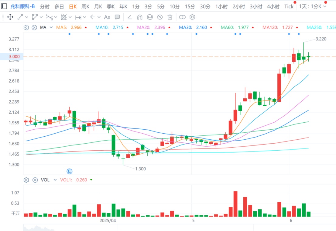 4月9日,兆科眼科股价受到恒指大盘震荡影响触底1.30港元,在此之后公司股价开启一轮波动上涨行情,6月5日盘中,公司最高股价达到3.22港元。也就是说,近2个月内,兆科眼科股价最大涨幅达到147.69%。