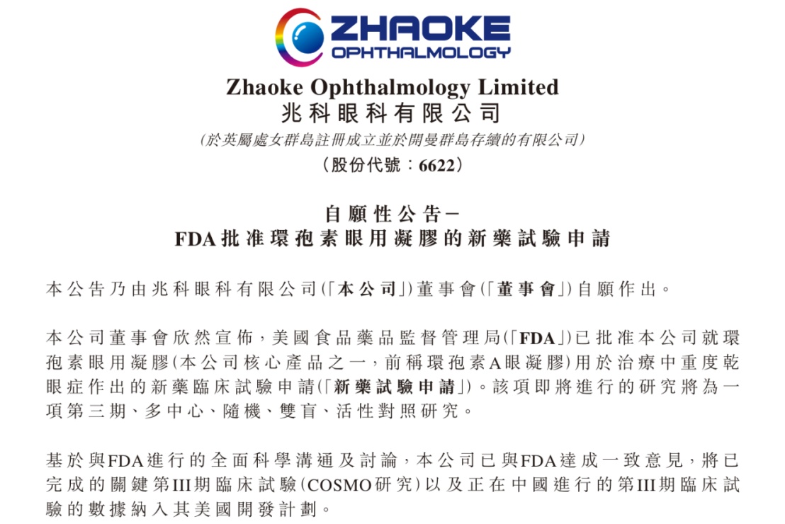 6月4日,兆科眼科发布公告,美国FDA已批准公司就环孢素眼用凝胶(公司核心产品之一,前称环孢素A眼凝胶)用于治疗中重度干眼症作出的新药临床试验申请。该项即将进行的研究将为一项第三期、多中心、随机、双盲、活性对照研究。