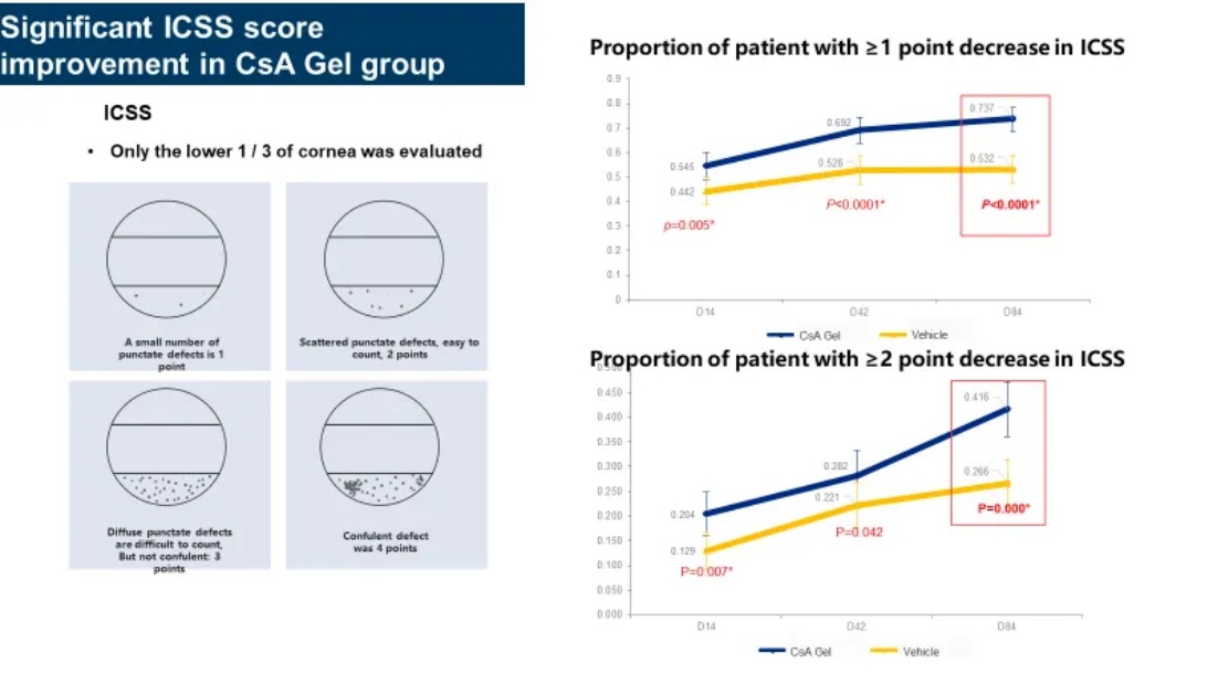 其此前中国III期临床共纳入了644例中重度干眼患者,1:1随机分为环孢素眼凝胶组及对照组,分别接受兆科环孢素眼凝胶一天一次,或空白对照一天一次的治疗,两组患者均接受羟丙甲纤维素滴眼液一天三次作为基础治疗。结果显示,环孢素眼凝胶治疗后2周,即可显著改善中重度干眼患者的体征,疗效显著优于对照组。