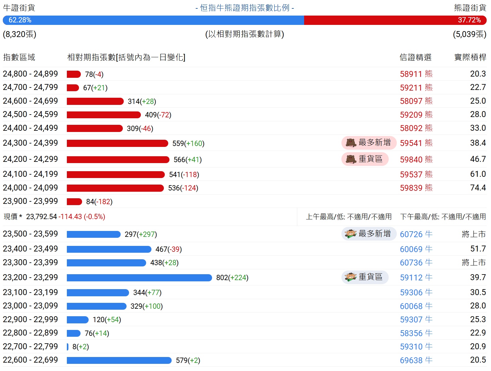 牛证街货重货区在23200 - 23299区间,该区间最新牛证数量为802张,较上一交易日增加224张;最多新增在23500 - 23599区间,该区间最新牛证数量为297张,较上一交易日增加297张。