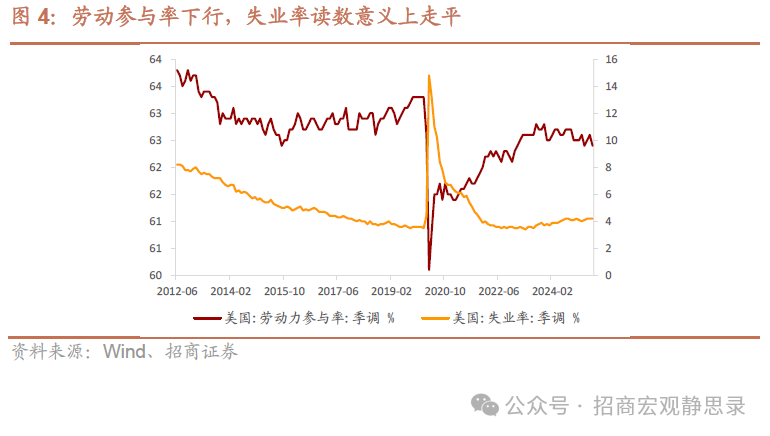 3)家庭调查口径数据反映出劳动力市场在温和降温。劳动参与率下降至62.4%(前值62.6%),主因25-54岁壮龄劳动参与率降至83.4%(前值83.6%),或反映出移民政策变化的影响。劳动力供给减少压制了失业率的反弹,5月U3失业率维持在4.2%(前值4.2%),覆盖劳动者范围最广泛的U6失业率在7.8%(前值7.8%)。
