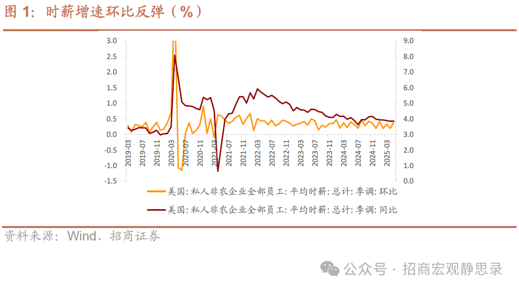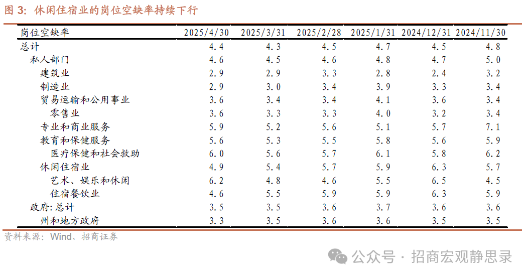 2)分行业来看,政府部门录得-0.1万人(前值0.1万人),其中联邦政府录得-2.2万人(前值-1.3万人),州政府录得0万人(前值0.3万人),地方政府新增2.1万人(前值1.1万人)。联邦政府在近三个月以来合计减少了4.4万人,尽管马斯克已经离开美国政府团队,由于BLS将带薪休假或持续领取遣散费人员计入就业人数,政府效率部(DOGE)减员的影响或仍在近月持续浮现。商业服务和临时支持服务业转负,商业服务录得-1.8万人(前值1.0万人),临时支持服务业录得-2.0万人(前值0.3万人)。医疗保健和社会救助仍是主要拉动项目,本期新增7.8万人(前值8.5万人)。休闲和酒店业录得4.8万人(前值2.9万人)。零售业降幅深化,录得-0.7万人(前值-0.3万人)。根据美联储最新褐皮书,关税和经济前景不确定性已经导致了多数地区企业的用工需求降温。