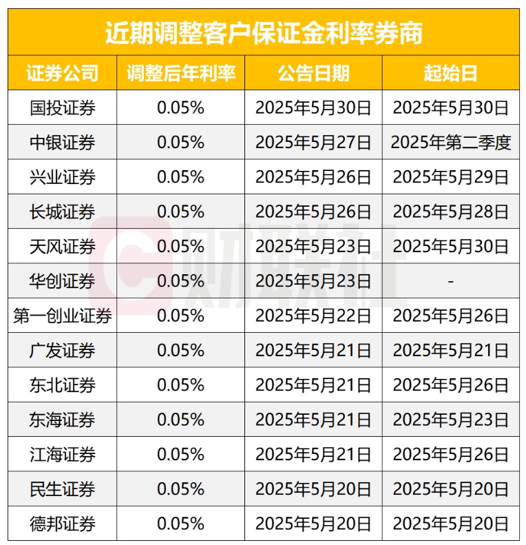 2025年5月,在银行活期存款利率下调至0.05%后,广发证券、民生证券等多家券商相继发布公告,将客户保证金利率下调至0.05%,达到历史低位。