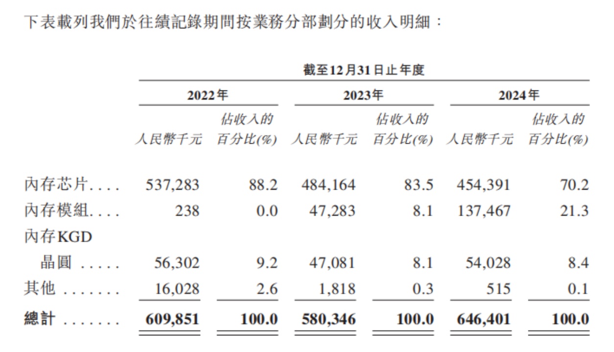 招股书显示,力积存储是一家专注于内存芯片设计及AI存算解决方案的高科技企业。2020年,公司通过收购Zentel Japan,整合了中日研发资源,逐步发展成为中国领先的内存芯片设计公司及AI存算解决方案供应商。其业务模式主要围绕内存芯片设计、封装和测试展开,产品涵盖内存芯片、内存模块、内存KGD晶圆三大板块。