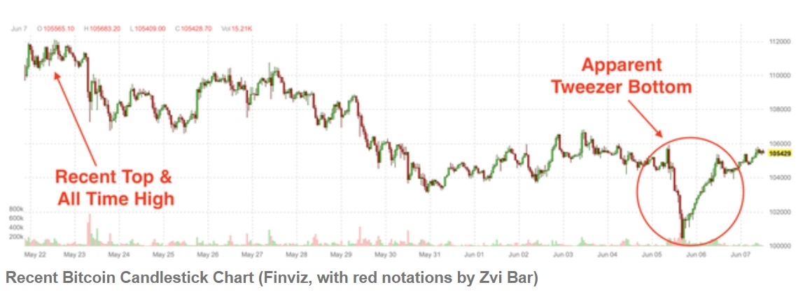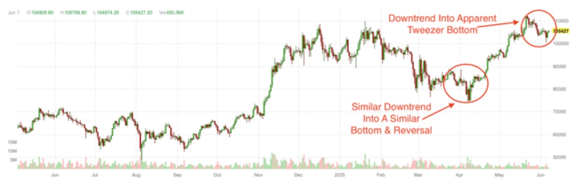 镊形底的特征是两根连续的蜡烛图具有相同或非常接近的最低价,其中第一根蜡烛图的最低价就是相同的低点。以下是其关键特征的分解:镊形形态必须形成于明确的下跌趋势之后,而比特币自5月下旬创下历史新高以来,过去几周一直处于下跌趋势中。