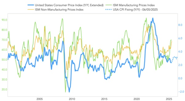 更重要的问题在于,关税是否会产生更大的影响,并改变过去三年中通胀似乎所呈现出的稳定态势。这一点已经在地区性美联储调查的物价支付指数以及ISM服务业和制造业报告中有所体现。数据表明,CPI的同比变化往往会比这些物价支付指数滞后约 6 个月。所以,如果物价支付指数从 1 月份开始上升,可能要到 6 月份的数据中才会开始看到这些信息在 CPI 报告中有所体现。
