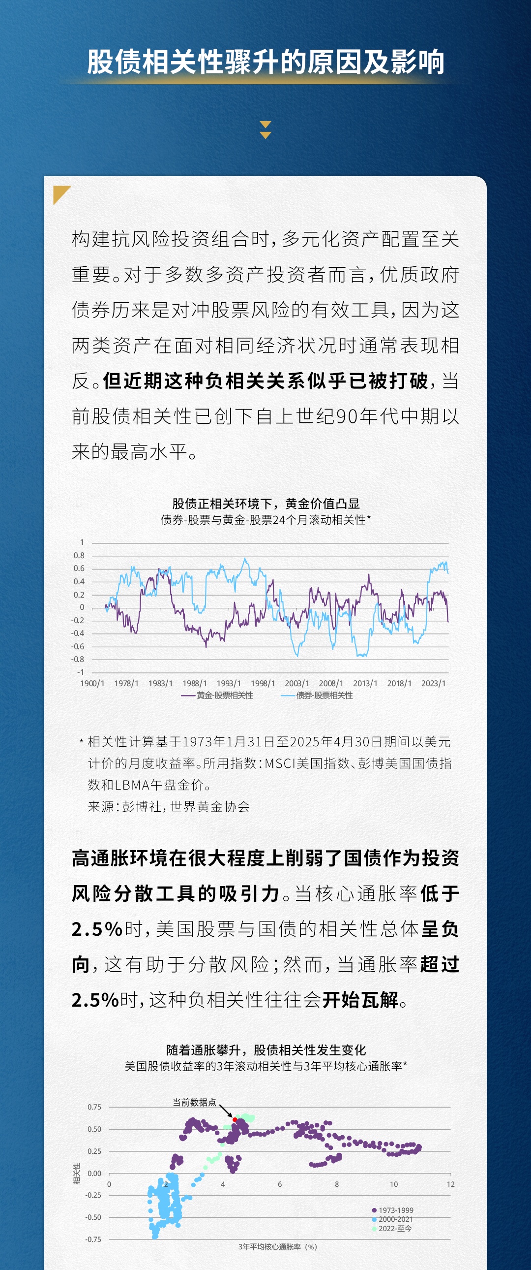 智通财经APP获悉,6月9日,世界黄金协会发文称,构建抗风险投资组合时,多元化资产配置至关重要。股票与债券收益的负相关性是平衡投资组合的基石,而这一相关性在当前通胀波动加剧的背景下正发生变化。就其对投资组合多元化的影响而言,股债相关性最终将趋于何种水平尚不明朗。但近期宏观经济环境有所变化,投资者需更加审慎。